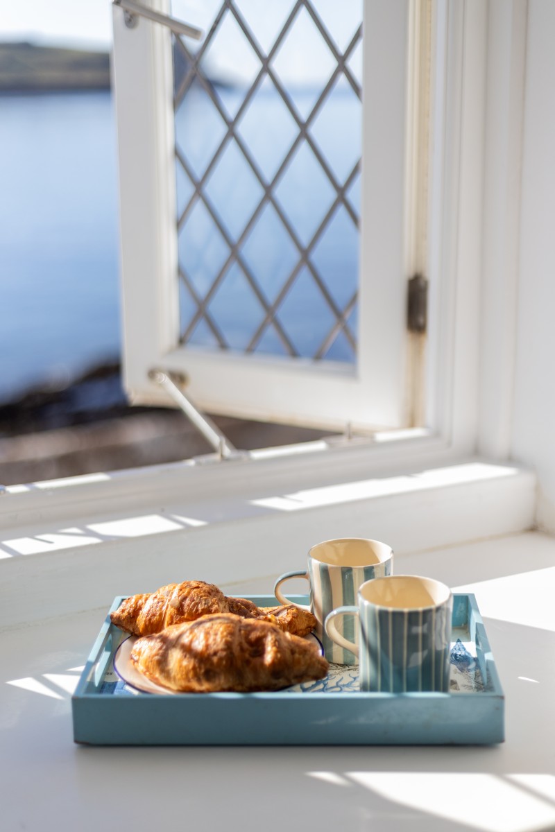 Inside, the cottage is light, bright and full of character. Picture windows flood each room with natural light, framing views across sparkling blue waters. The main sitting room is a cosy haven with armchairs placed either side of a large stone fireplace, while the plush sofa invites you to stretch out and unwind. It’s a perfect space for morning coffee as the fishing boats head out to sea, or for an evening curled up with a good book and a glass of wine. A second sitting room, complete with sofa and TV, offers a snug space for family movie nights or quiet relaxation.